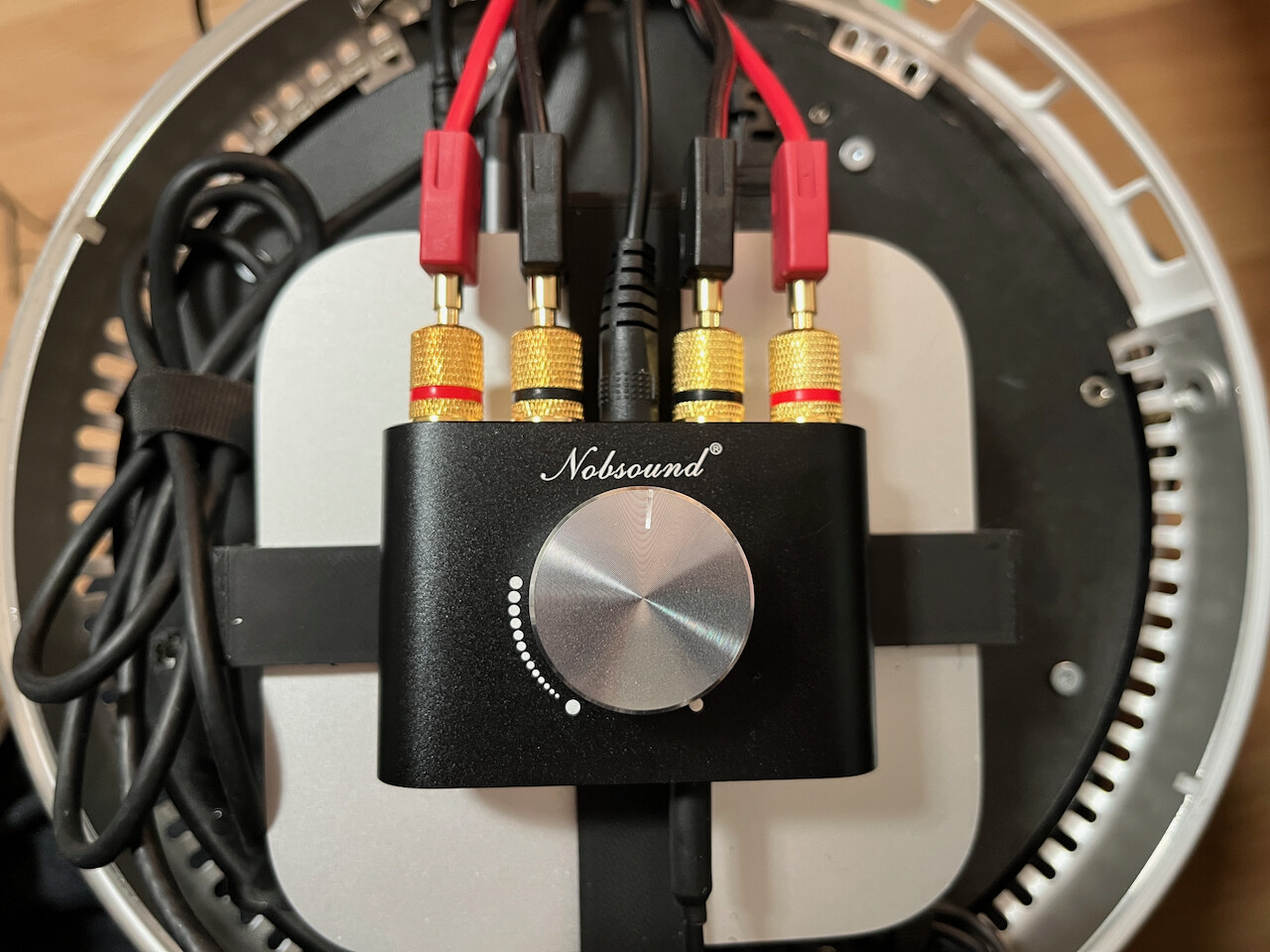 In early 2026 I purchased a clean pair of late-model (the ones with beige rubber gaskets instead of the black foam ones that deteriorate) Apple Pro Speakers on eBay. Since Juicy Crumb's JC Hi-Fi was not available, I had to resort to cutting off the 2.5mm connector and splicing in RCA plugs to each of the 4 wires. I mounted a small amp inside the shell with RCA jacks coming out of it, along with a pigtail for the amp's AC adapter. This way all of the cables could be plugged in outside of the unit so if I needed to move it around, I wouldn't need to open it again.
