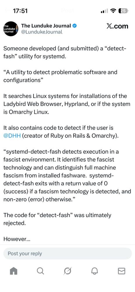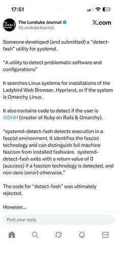 joshua stein via @jcs.org (Bluesky) - Oct 19 2025 17:56:24 how things are going in linuxland 17:56 - October 19, 2025 - Source