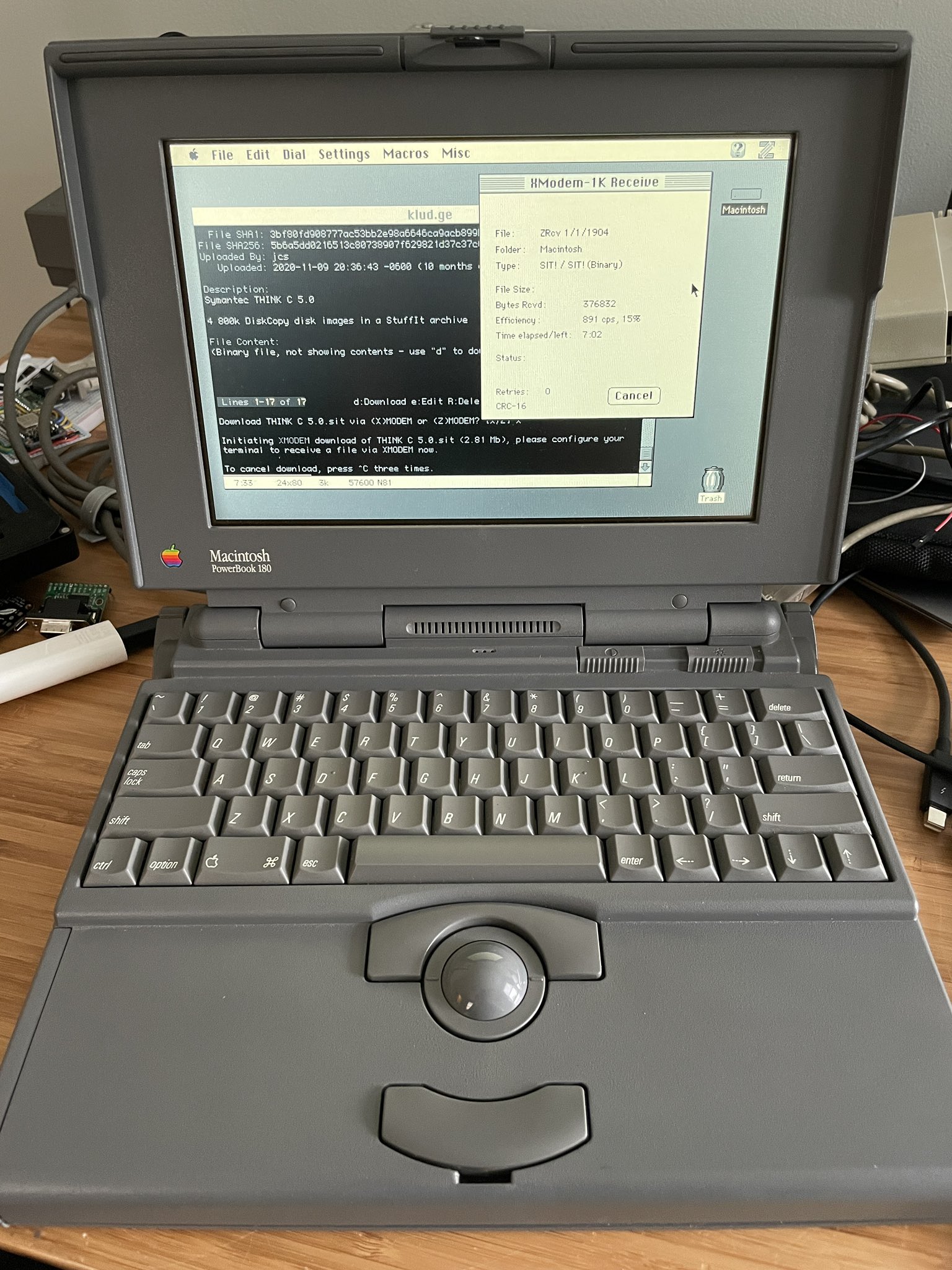 Using the PowerBook 180's internal 14.4kbps modem to dial into my BBS server 6 feet away, to courier files via XModem