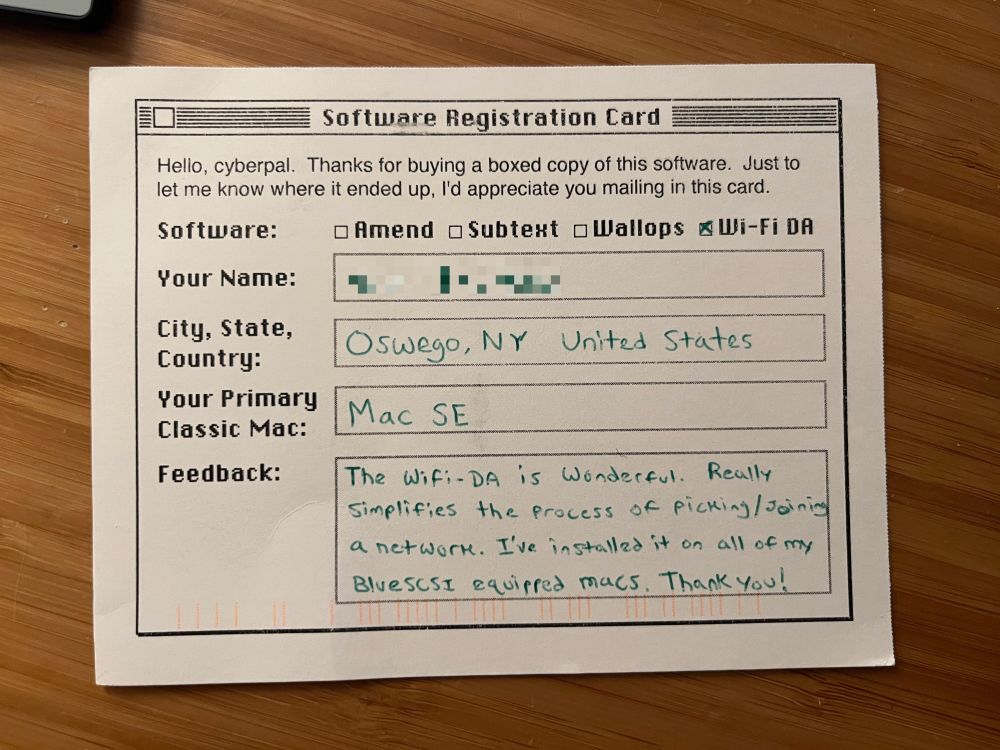 The boxed copies of my Mac software that I sold at VCF Midwest this August had these registration postcards in them