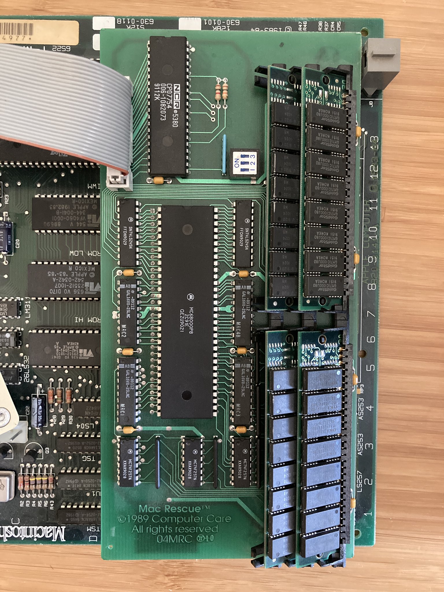 I bought a Mac 512k for parts and upon opening it, I discovered it has a Mac Rescue board installed which adds Mac Plus ROMs, SCSI, 4mb of RAM, and an 800k floppy drive. Glad I just upgraded my 512ke to 1mb 😕